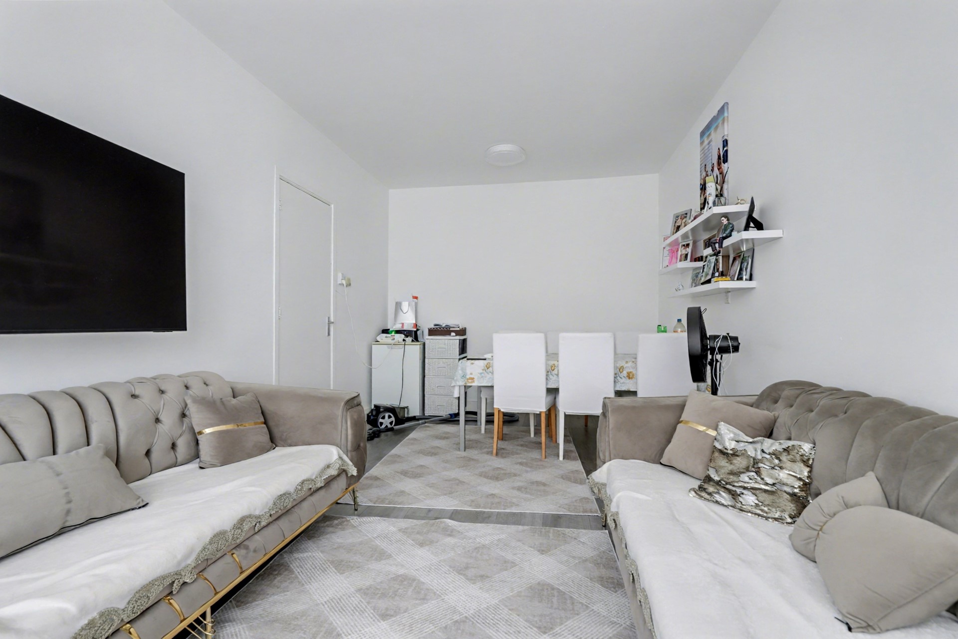 Open portiek met entree op de eerste verdieping. Hal met meterkast (4 groepen met aardlekschakelaar), separaat toilet en doucheruimte voorzien van wastafel. De lichte woonkamer biedt vrij uitzicht.