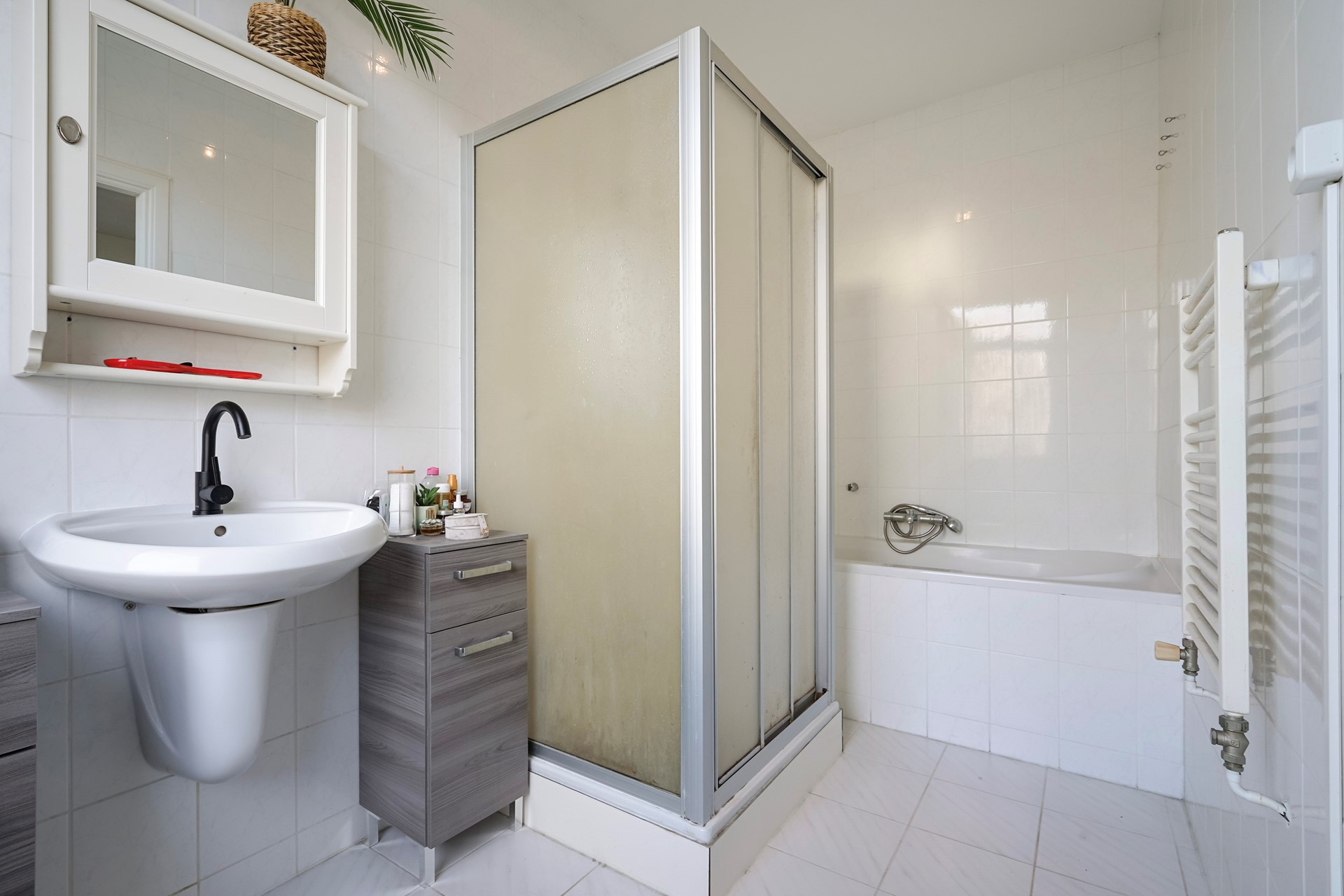 - Badkamer: Nette en ruime badkamer met ligbad, wastafel, douche en ribbenradiator