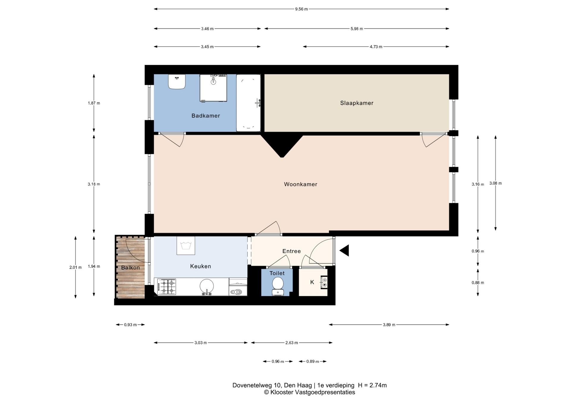 Balkon aan de achterzijde van 2 m2.